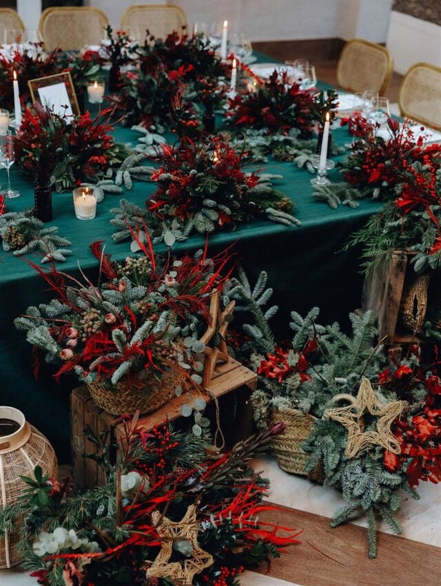 Cristina y Gonzalo eligieron el 5 de diciembre para celebrar su boda en pleno corazón de España, con una atmósfera que fusionó la calidez del invierno con detalles navideños elegantes en cada rincón. Su enlace, celebrado en una finca madrileña, estuvo marcado por una decoración inspirada en la Navidad, con coronas sobre chimeneas, ramas de encina con bolas colgantes y centros de mesa coronados por velas encendidas, creando un ambiente que parecía salido de un cuento invernal. Esta boda real demuestra cómo casarse en diciembre en España puede ser romántico, visualmente impactante y profundamente personal, abrazando la estación sin perder sofisticación.