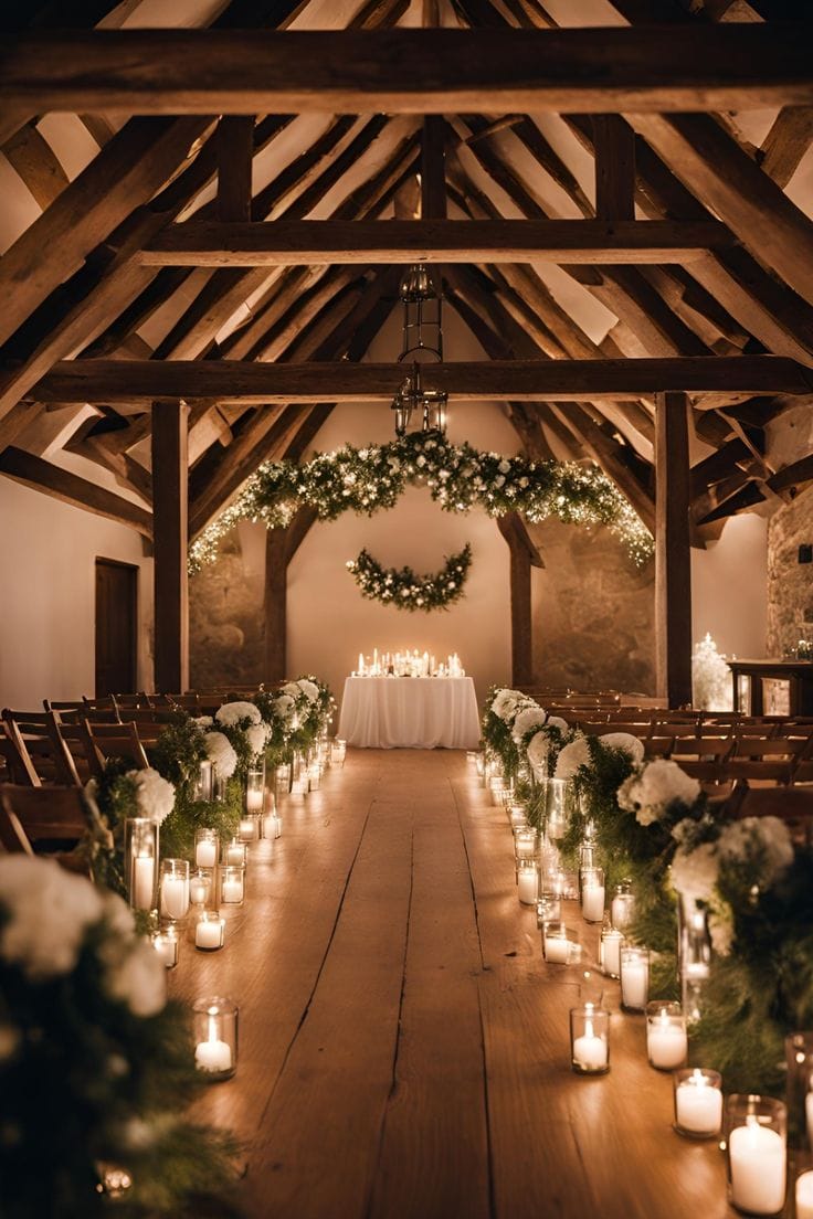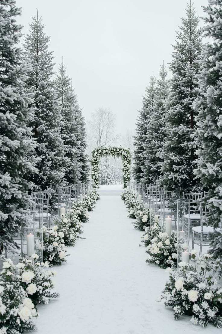 - Blanco invernal con acentos plateados: una estética que evoca nieve y luz, ideal para bodas en montaña o invernales elegantes.