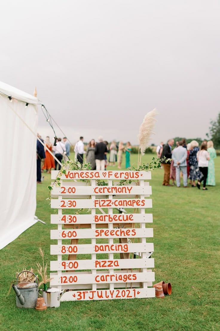 Resulta muy útil utilizar carteles o pizarras con el horario aproximado de la ceremonia, la comida, los discursos y otras actividades. Estas señales ayudan a que los invitados tengan una guía flexible, sin sentir la presión de seguir una cronología estricta, y fomentan que puedan participar plenamente en cada parte del día, a su ritmo y con libertad.
