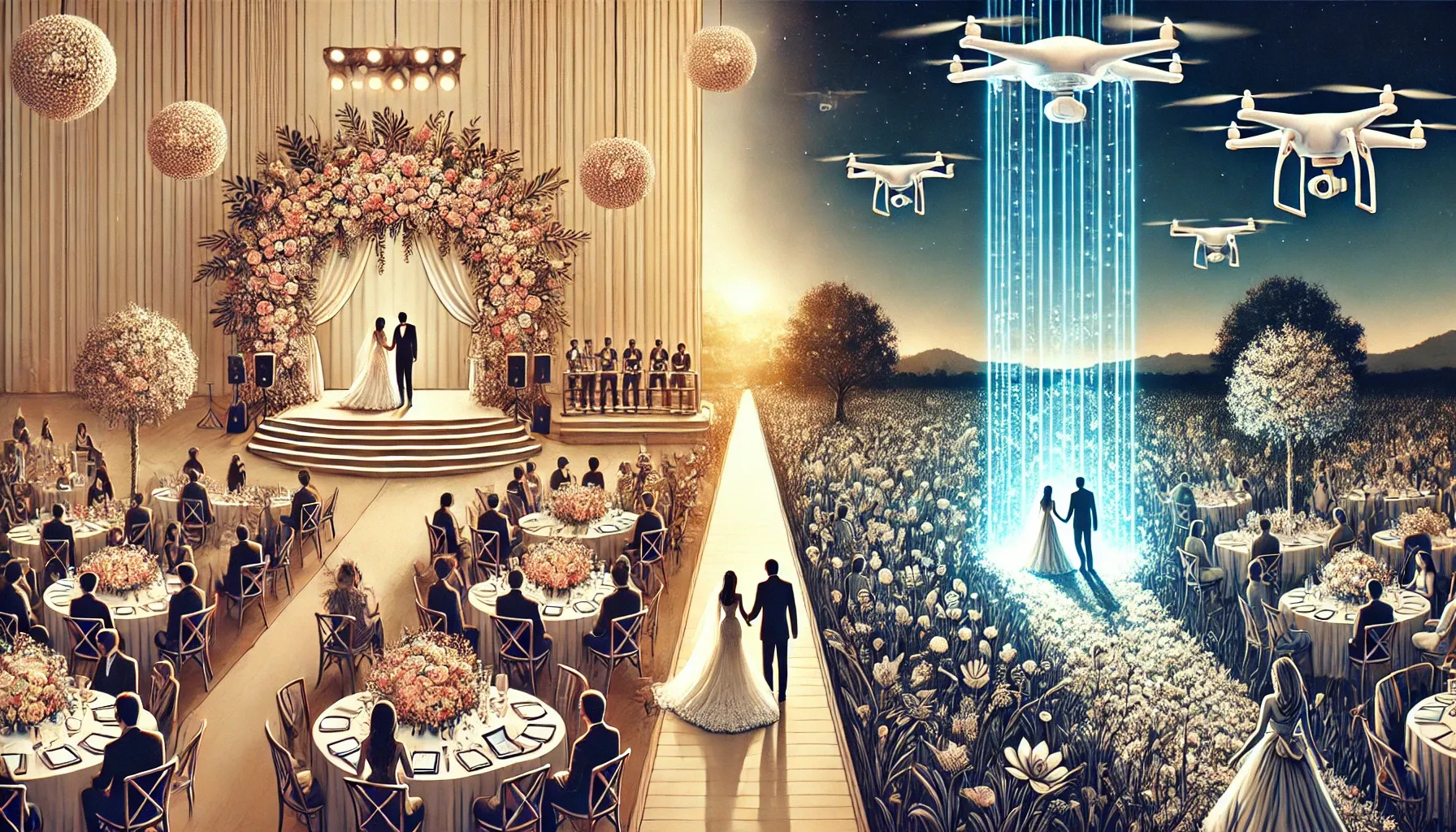 Y para cerrar este artículo poniendo el foco en lo que es ilusionante, os recuerdo que el futuro de la industria de las bodas apunta a espectacular, literal y figuradamente. Lo confieso. Le pedí a Chat GPT que me creara 6 imágenes para añadir a este artículo que describieran las bodas del futuro y creo que ha exagerado un pelín. Es cierto que hay datos que avalan nuestro propio crecimiento. Pero en esa búsqueda de lo impresionante, corremos el riesgo de olvidar lo más importante: la emoción, la autenticidad y el recuerdo. Y quizá también lo íntimo, lo sencillo y lo trascendente. Sea como sea, sepan ustedes que UNIONWED siempre será el espacio donde debatir y construir nuestro futuro.